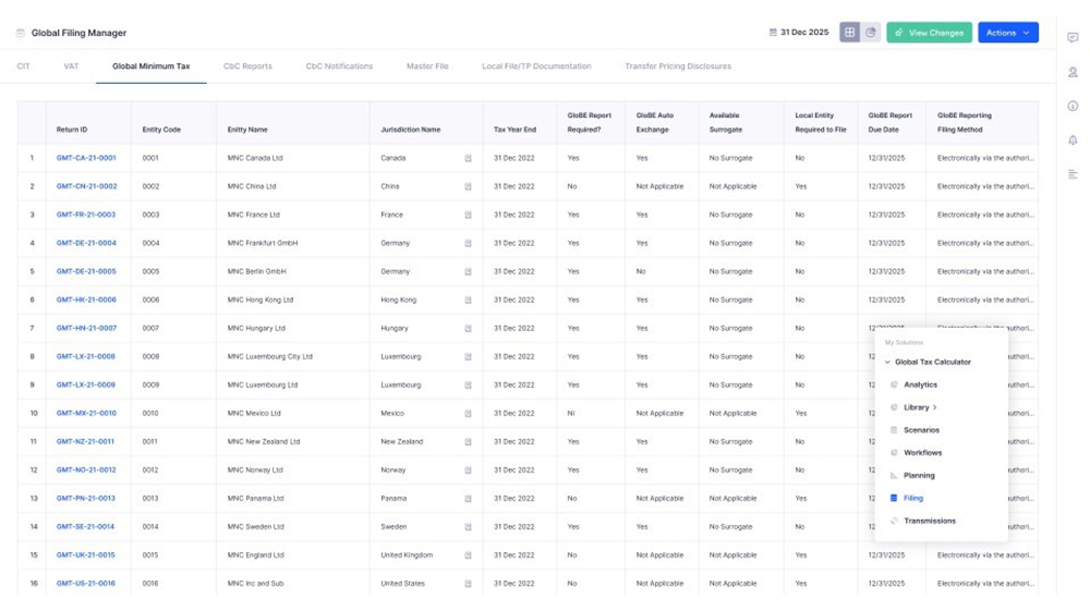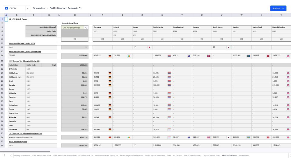 内置 190 多个国家/地区的税率,以及用于 QDMTT、STTR、IIR 和 UTPR 的特定于国家/地区的计算器,可确定有效税率 (ETR) 和补足税义务。