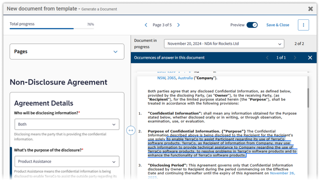文档自动化工具通过预设模板帮助您自动生成合同。这些工具可从现有记录或过往文档中提取数据,仅需极少的人工输入,即可快速生成可用合同,确保效率与一致性。